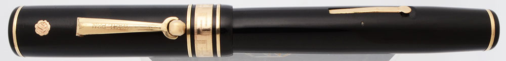 Color Black cap and barrel with gold trim. The pen has flat black pieces on both ends and several decorative bands. There are two narrow bands in total and a 3/16" decorated "deco" cap band (with a Greek key pattern). The trim is gold filled and it has the gold seal guarantee stamped on the cap.