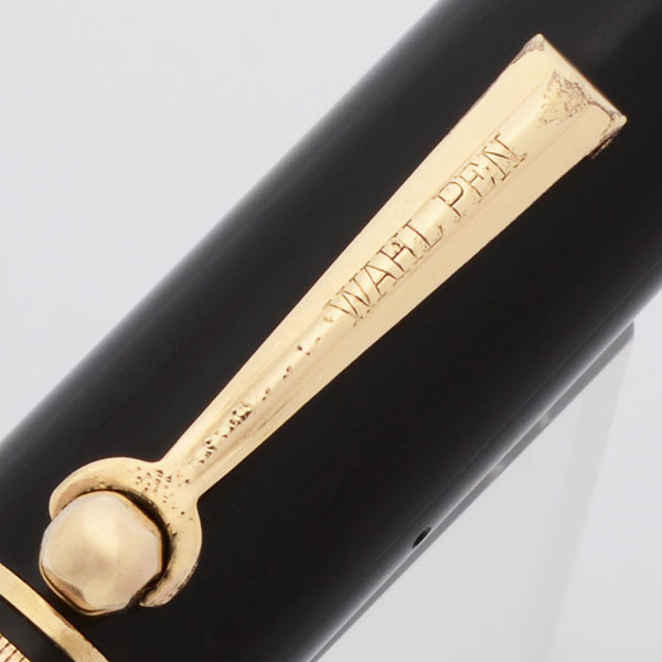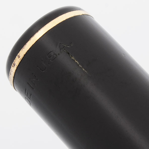 Condition Excellent condition for this oversized, shiny, black pen with an ornate cap band. The cap and barrel have moderate scratching. The barrel has marks caused by the cap lip. The cap has a 1/4" jagged scratch starting at the A in USA imprint at the top of the cap (see photo below). The two thin bands at the end of the barrel and near the top of the cap have plating wear and scratching and the one at the top of the cap has some pitting. The wide cap band that is decorated in a Greek key pattern as well as the two thin bands that surround it have small marks and moderate scratching but the pattern is clear. The lever has a bit of plating wear and some long thin scratch marks. The imprints are clear.