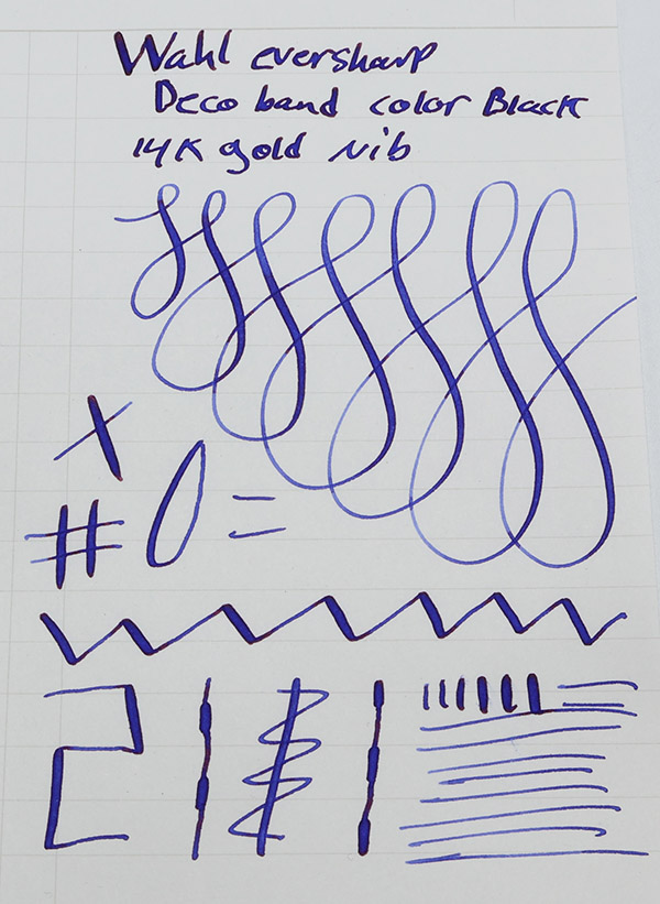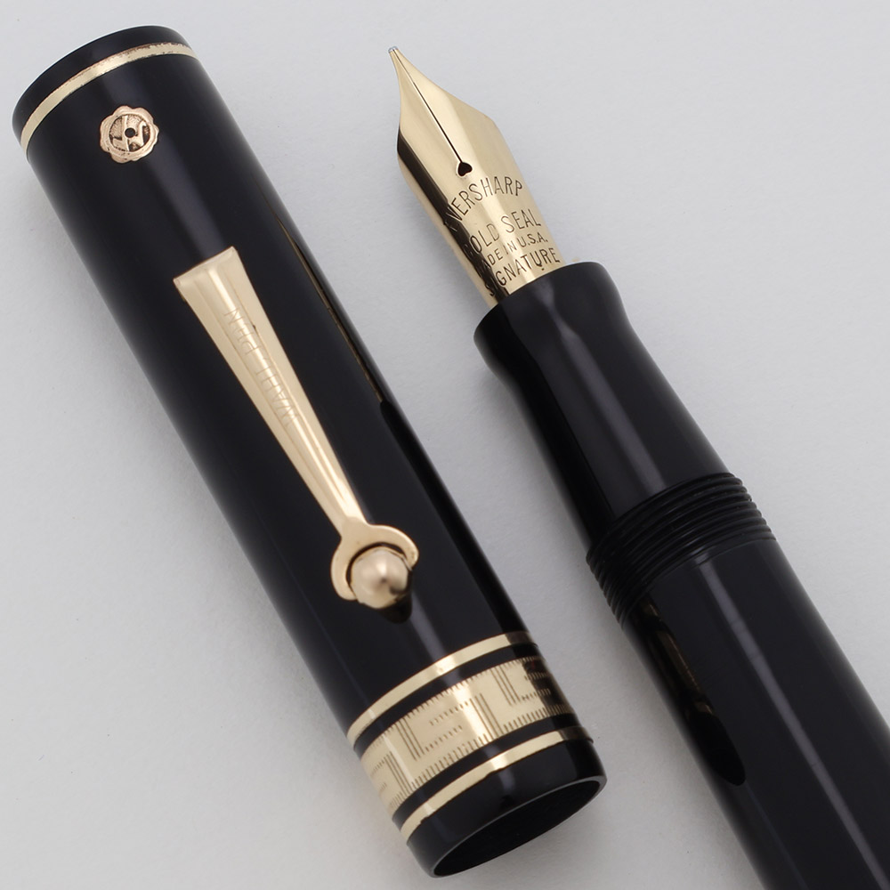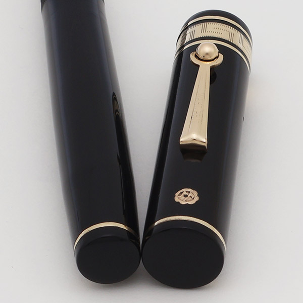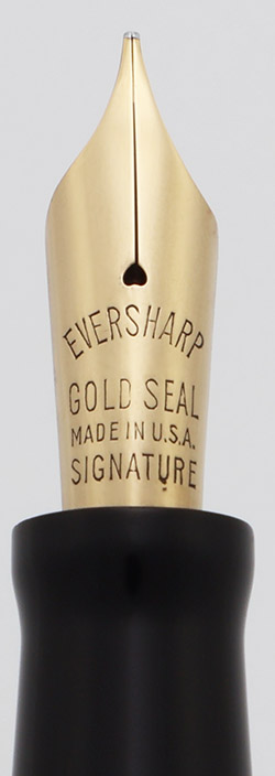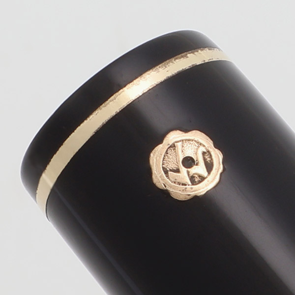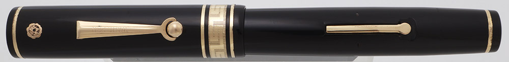 Color Black cap and barrel with gold trim. The pen has flat black pieces on both ends and several decorative bands. There are two narrow bands in total and the cap features a 3/16" decorated "deco" cap band with narrow bands on either side. The trim is gold filled and it has the "double check" gold seal on the cap above the clip; the gold seal has been punched, indicating that the full warranty was withdrawn.