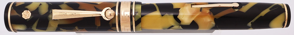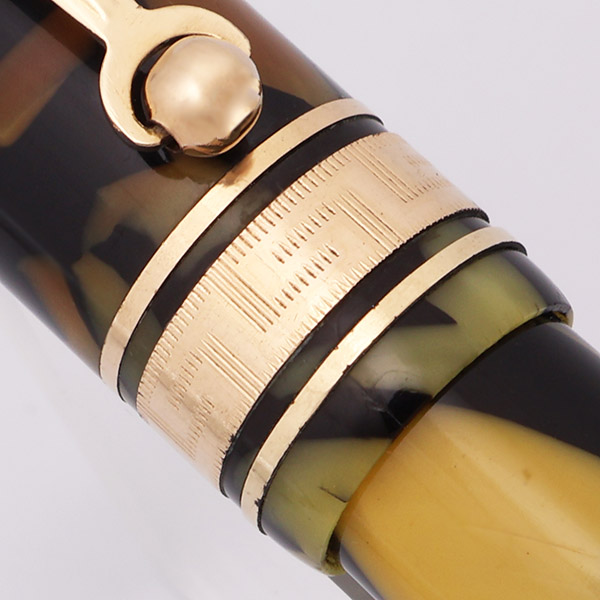 Condition Excellent condition with some discoloration. There is light to moderate handwear and scratching on the cap and barrel. The clip has some tiny shallow dents and small specks of plating wear. The trim band at the top of the cap has dots of plating wear and light scratching and denting. The bands near the cap lip have small touches of plating wear and scratching. The cap lip has two cracks that reach the lower cap band, and one shorter one, and we've included detailed shots of this area in the photos. The front of the section has some tiny chips out of the edge. The barrel has light marks from the cap, and some tooth marks at the end of the barrel. The trim ring at the end of the barrel has some tiny dents/bite marks; this ring also also spins freely in its groove, but does not seem to be in danger of coming off. The lever bar has plating wear along the sides. The pen is fully restored and working well.