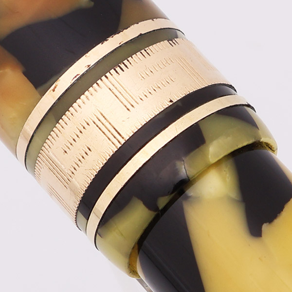Color Black and pearl cap and barrel. The pen has flat black pieces on both ends and several decorative bands. There are four narrow bands in total and a 3/16" decorated "deco" cap band. The trim is gold filled and there is a gold seal guarantee on the cap.