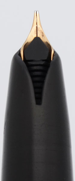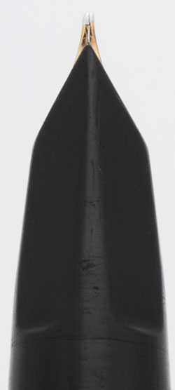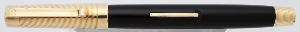 Condition Excellent condition with no cracks, or chips. This is a classy, shiny pen in a unique design. The barrel and section have moderate wear (especially near the end of the barrel). The lever has plating wear along the edges. The cap looks excellent. It has a tad of plating wear on the broad cap band area as well as along the edge of the top of the cap. The top edge of the cap also has a small dent. The clip has some tiny dots of plating wear near the end but most of it looks fantastic. The imprints are clear.
