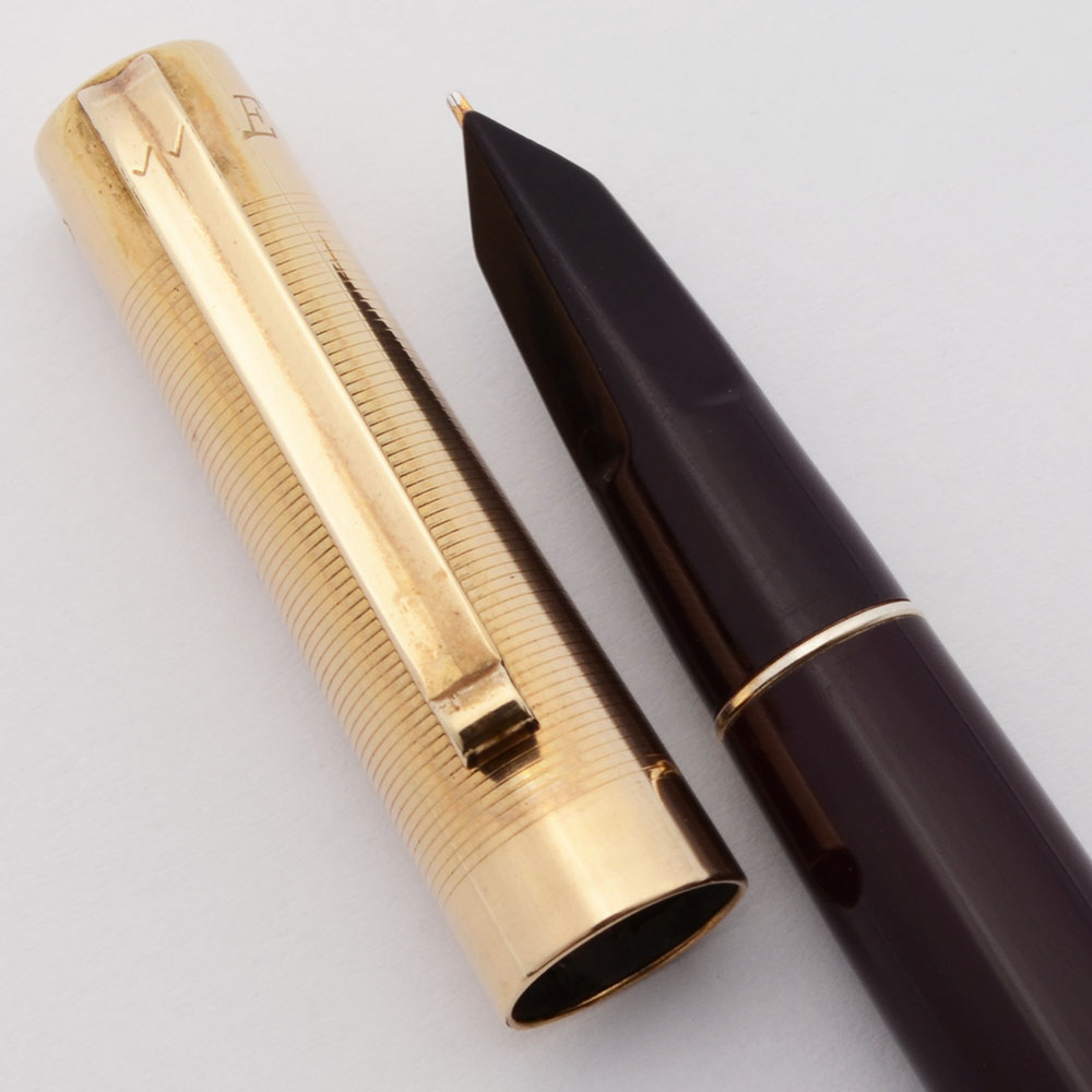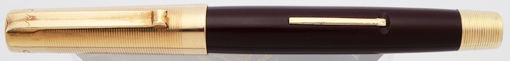 Color Burgundy body and section, 1/10 14k yellow gold filled cap and barrel end piece (with stacked coin lines).