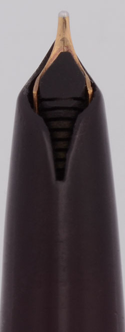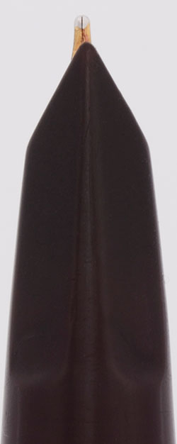 Condition Excellent condition with no cracks, chips, dents, or dings. This is a small, shiny pen with a unique design and in a pretty color pattern. The barrel and section have mainly light scratching (the section has a little more than the barrel). The barrel has some light marks caused by the cap lip and some long, thin scratch lines. The gold end piece of the barrel has plating wear along the bottom edge and microscratching elsewhere. The cap has microscratching, some plating wear along the upper edge, and a few miniscule dots of pitting here and there. The clip looks very good, with a tad of plating wear along edges. The imprints are clear.