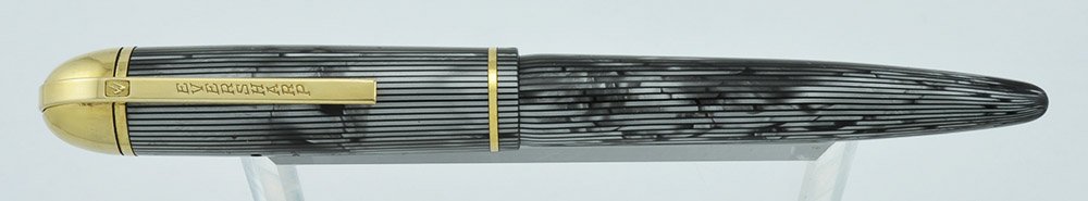 Color Beautiful grey moire striped black and grey celluloid with a gold plated cap derby and gold plated trim.