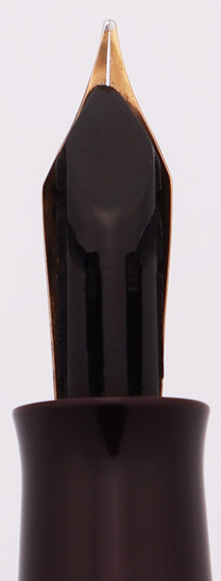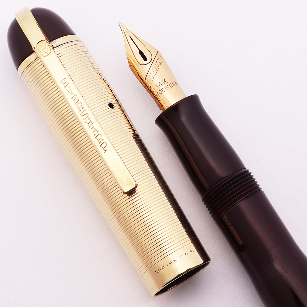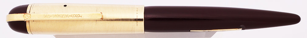 Color Burgundy, a dark purplish-red, barrel and section with 1/10 14k gold-filled cap. There are grooved lines around the caps.