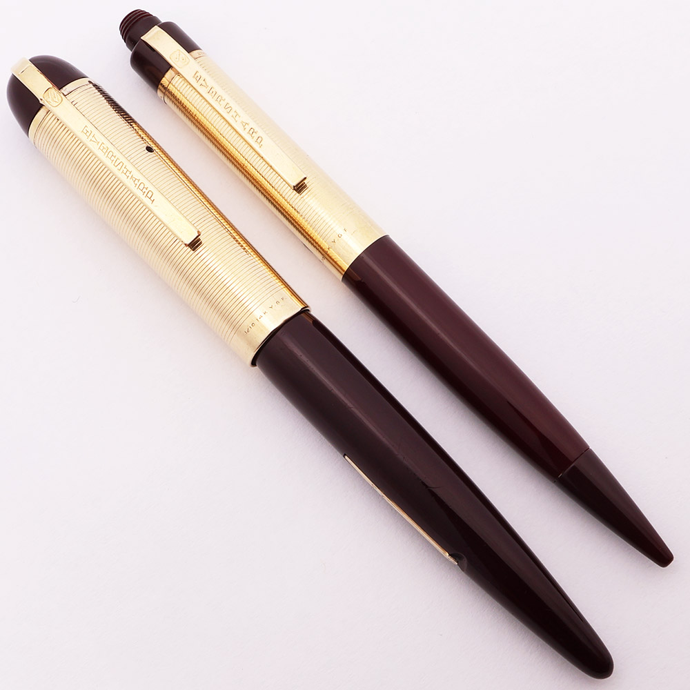 Condition Excellent condition. The fountain pen cap looks good in the hand, though with magnification you can see small spots of brassing, as well as on the top edge of the gold-filled portion near the clip. The clip also has brassing on the side edges and around the open end. The barrel has light to moderate scratching, increasing near the pointy end. There is some brassing on the lever bar. The mechanical pencil looks good. The cap has light scratching and wear, but minimal brassing and no plating wear. The clip has touches of brassing along the sides. All imprints are clear and there is no personalization. Both pieces are working very well.