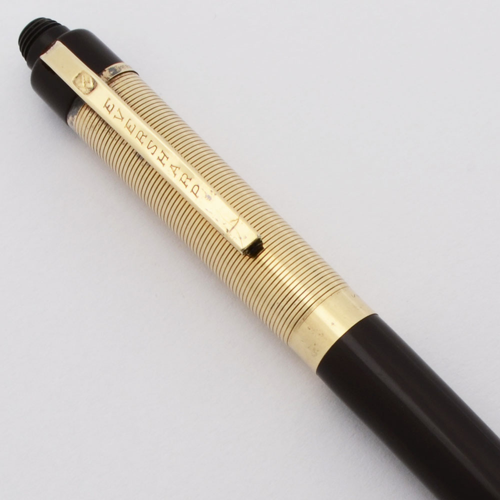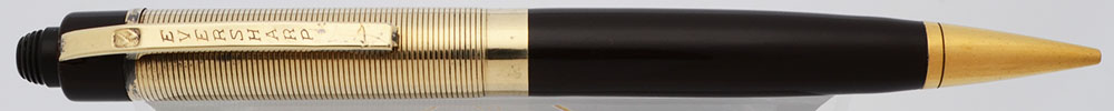 Condition Very nice condition with no cracks or chips. This is a shiny, classic mechanical pencil in an excellent color and material combination. The barrel has moderate scratching with a few small, deep scratches and a slight depression just under the cap lip. The cone has brassing and light microscratching. The ringed gold portion of the cap looks excellent with just a small area of pitting near the very top. The 3/16th cap band has some small dots of pitting as well as microscratching. The clip has scratch marks at the very end and light scratching elsewhere along with small dots of pitting here and there, and is a bit wavy (bent). The top clicker/eraser cap look great. All imprints are clear.