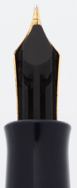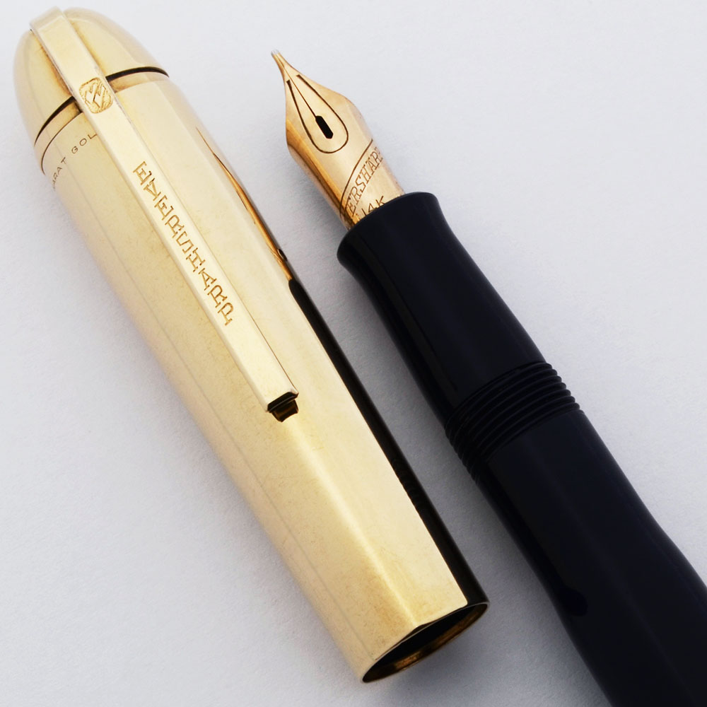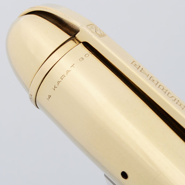 Condition Excellent + condition with no cracks, chips, dents, or dings. This is a lovely, shiny pen with classical styling with a starkly tapered appearance. The barrel has marks caused by the cap lip and light to some moderate scratching especially on either side of the lever, particularly on the right side. The lever has long, thin scratch lines down the front but it is still quite golden. The cap is beautiful, gold, and shiny. It has light microscratching but is one of the best solid gold overlay caps we have seen. The imprints are clear.