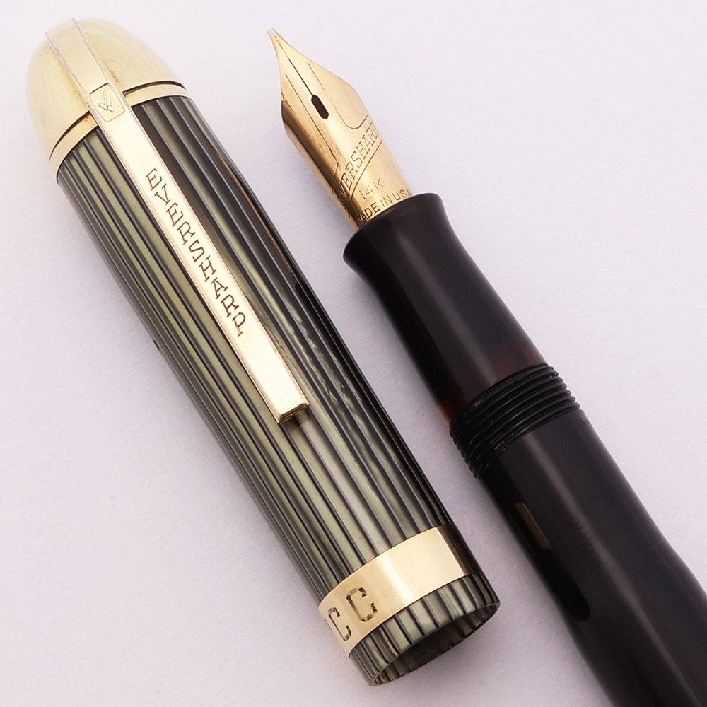Condition Excellent condition with no cracks or chips. This is a very tapered, shiny, classically styled pen that looks great. The barrel has marks caused by the cap lip and light to moderate scratching with the heavier scratching around the lever. The lever has plating wear. The cap has light scratching. The cap band has moderate microscratching and a few tiny dot marks. It is personalized: "WCC". The clip has a little bit of plating wear along the edges and microscratching all over. The top gold derby has a slight dent on top as well as microscratching. The imprints are clear.