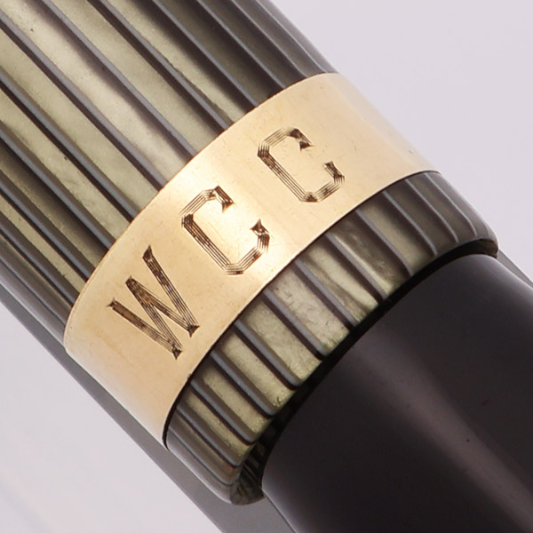 Color Black barrel. The cap is moss green and black striped. Gold plated cap derby and trim. The cap band has a personalization, "WCC". There is an amber viewing window at the bottom of the section.