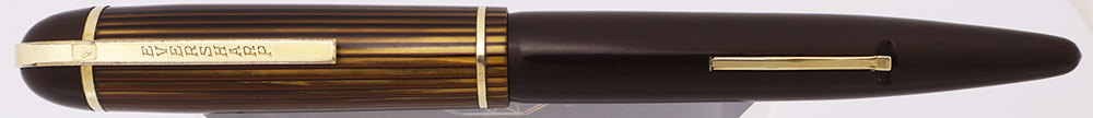 Condition Excellent condition. This is a handsome pen with a tapered, streamlined profile and striking striped cap. The cap and barrel have light to moderate scratching. The end of the barrel has some cracks in it. We don't have pictures of these, but they don't affect the pen's function. There is moderate scratching on the barrel, and also some marks near the front of the barrel from the cap. The lever has a tad of plating wear along the edges and light microscratching. The thin cap band has light scratching. The clip has plating wear on the corners of the open end, and along the edges. There are moderate scratches on the derby. The imprints are clear.