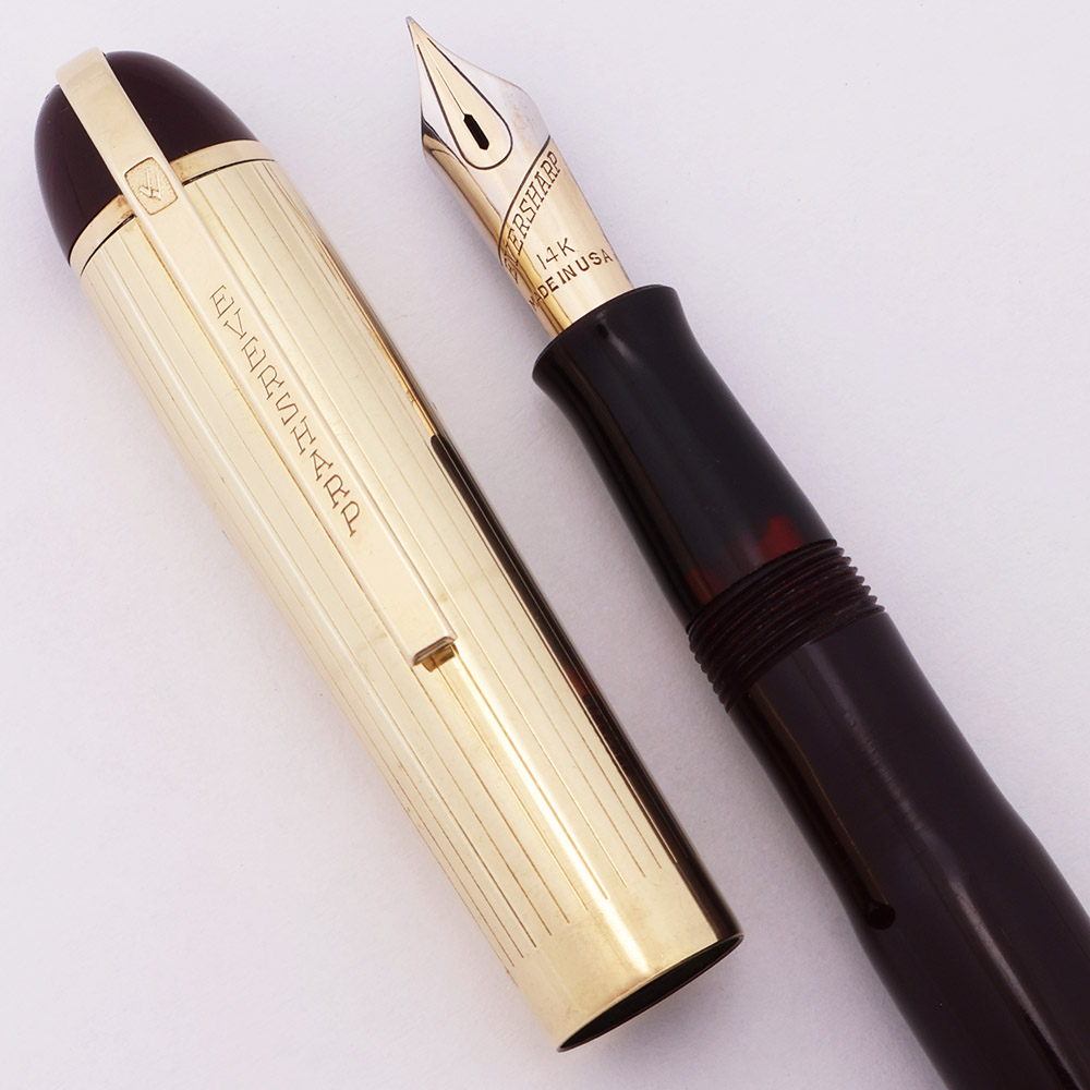 Condition Excellent + condition with no cracks, chips, dents, or dings. This is a lovely, vintage pen, with a velvety black body and with a shiny gold parallel line pattern cap. The barrel has marks caused by the cap lip and light to moderate scratching. The lever has moderate microscratching and a tad of plating wear along the edges. The cap has light to moderate microscratching. The cap derby has a few scratches. The clip and clip ring look great. The imprints are clear.