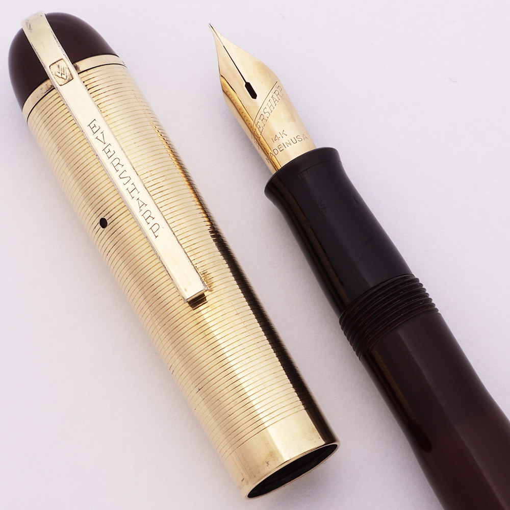 Condition Excellent condition with no cracks, chips, dents, or dings. This is a beautiful, tapered pen, that is shiny and in a great color combination. The barrel has marks caused by the cap lip and light to moderate scratching. There are a few long scratches on the barrel. The cap has light scratches with a handful of long, thin scratches near the clip and on the opposite side of the clip. The brown derby has a few small scratches. The clip has some plating wear along the edges and at the top where it goes over the derby. The lever has light, long, thin scratch lines. The imprints are clear.