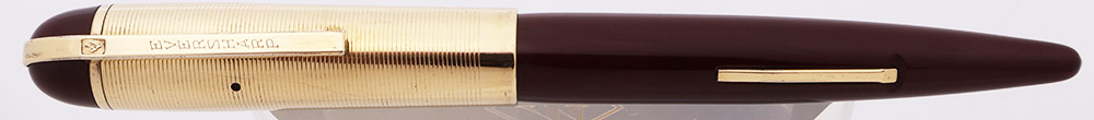 Color Burgundy body with a 1/10 14k yellow gold filled cap and trim. The cap has a pattern of lines stacked horizontally.