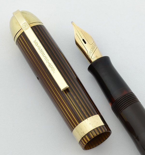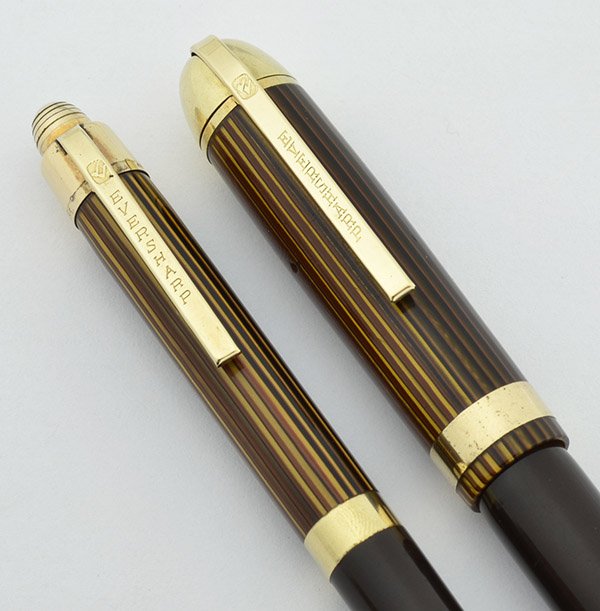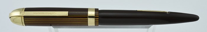 Color Brown striped cap and solid brown barrel, gold filled trim. Uncommon wide cap bands and gold derbys.