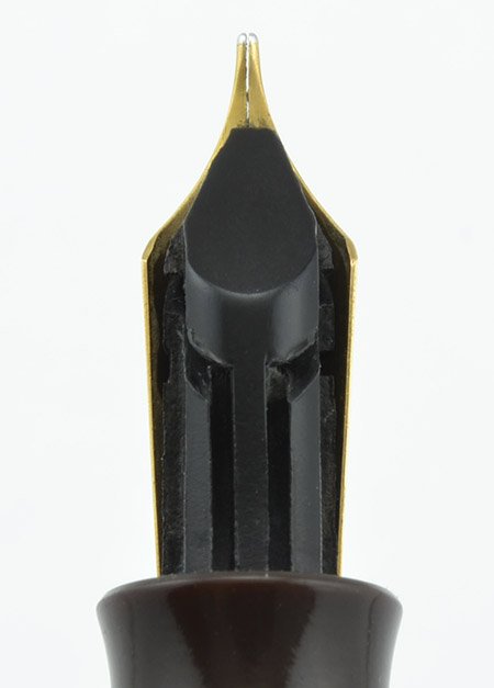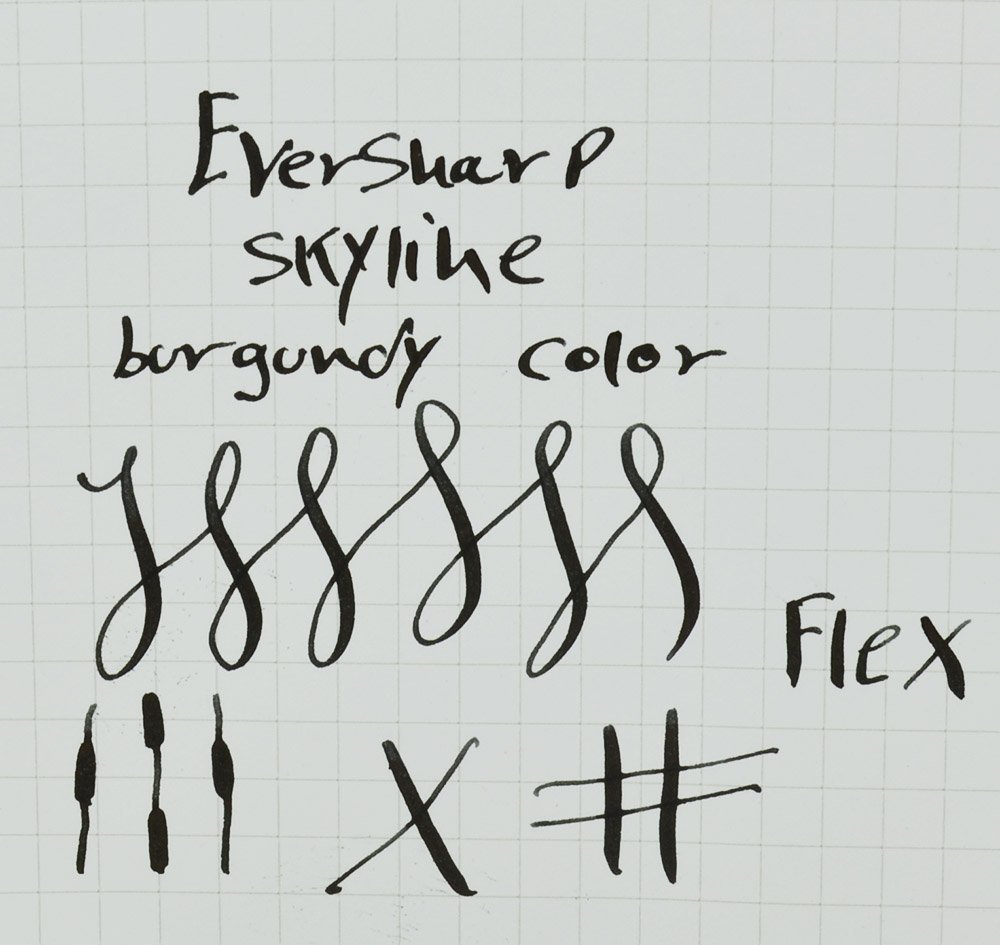 Nib Medium-fine genuinely flexible nib, not full flex but better than semi-flex. 14k. The nib looks very nice. It's a medium fine writing line when unflexed. See the writing sample below. (It says burgundy Skyline on the writing sample, but it does refer to this pen.)