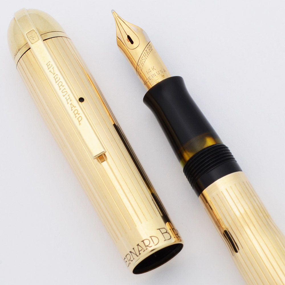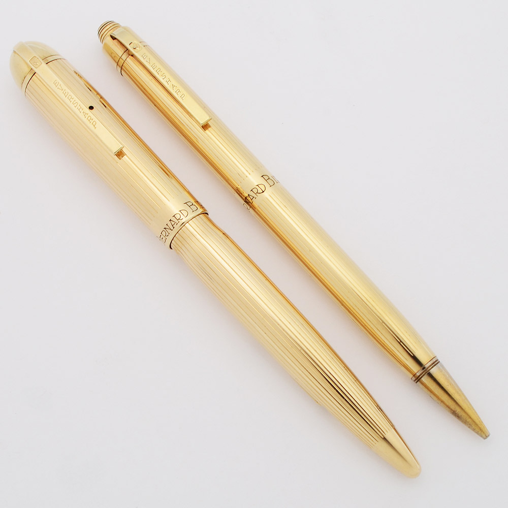 Condition Excellent condition. This is an elegant, shiny set with classic lines. The fountain pen barrel has marks caused by the cap lip; otherwise, it looks quite nice and shiny. The cap has plating wear on the derby, where the clip attaches over the top. Otherwise the cap has some light scratching and the clip looks great. The mechanical pencil has a lot of brassing on the nose cone. The ring that holds the clip onto the barrel has brassing and plating wear. Both pieces are personalized with the name "BERNARD BIRMBAUM" on the cap band. In box.