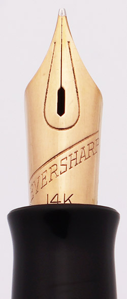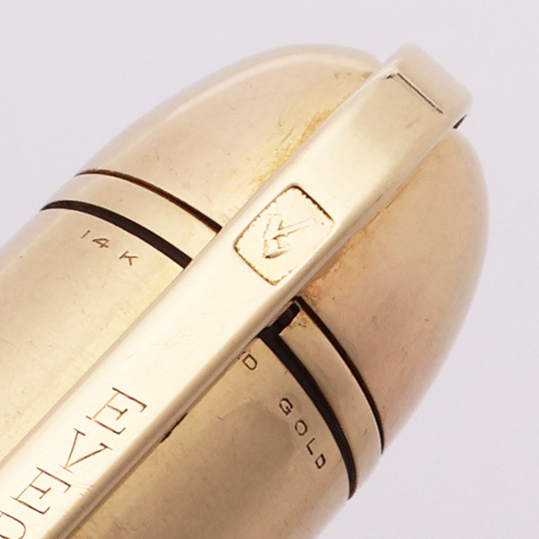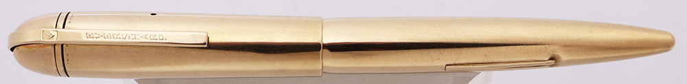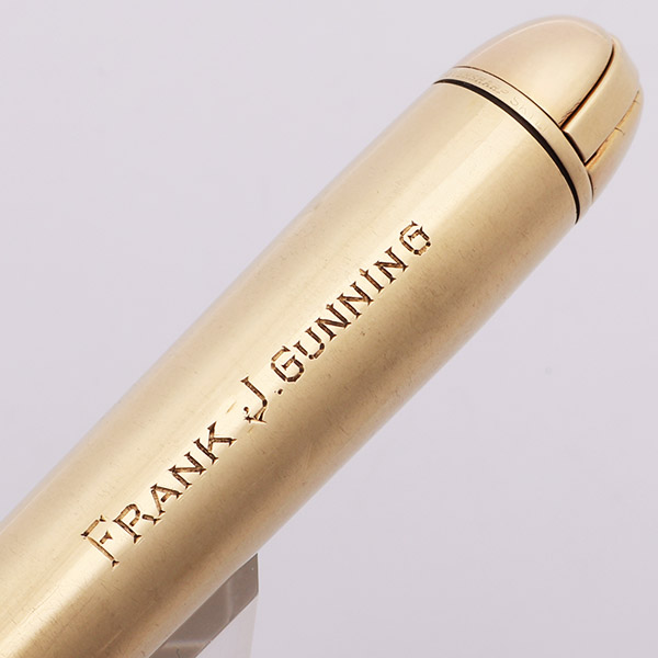 Condition Excellent + condition for this weighty solid gold fountain pen. The cap and barrel have light scratches and polishing marks. Looking at the horizontal shot, we see that the cap and barrel are just a touch misaligned, and the pen has just a touch of a bend in the middle. The cap is personalized with the name "FRANK J. GUNNING" in capital letters. There is a small (~1/8") shallow dent on the cap about 3/16" below the personalization. The top of the barrel where the cap fits over it has horizontal capping lines. The section coloration is bright and shiny black; it has horizontal capping lines. The clip looks great. The imprints are clear.