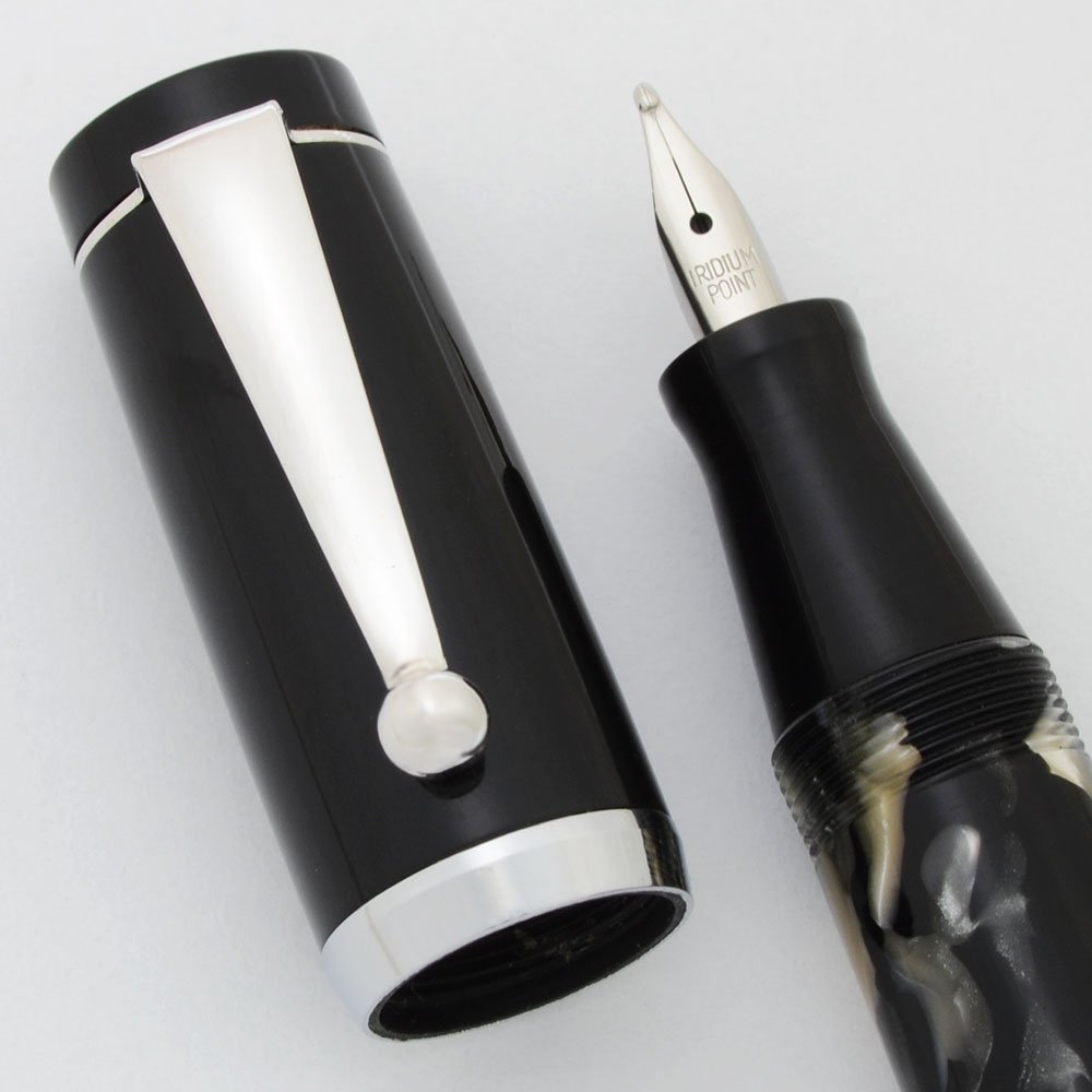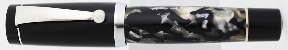 Color Black Pearl marbling on barrel. Black cap and barrel end piece. Silver colored trim and clip.
