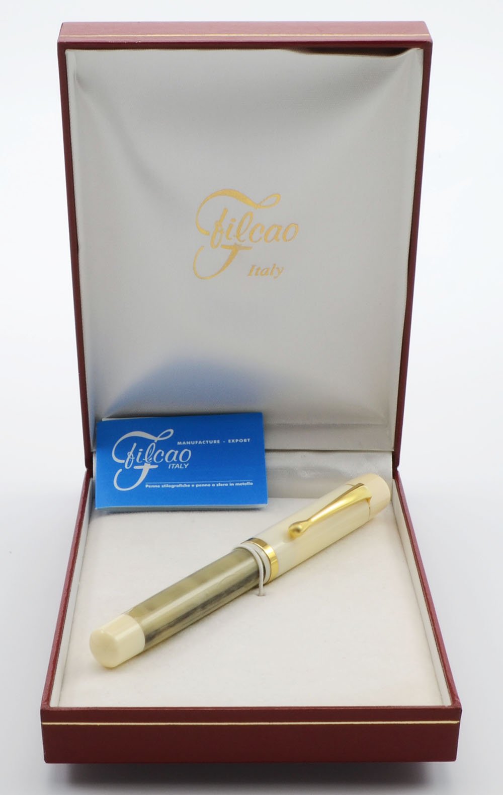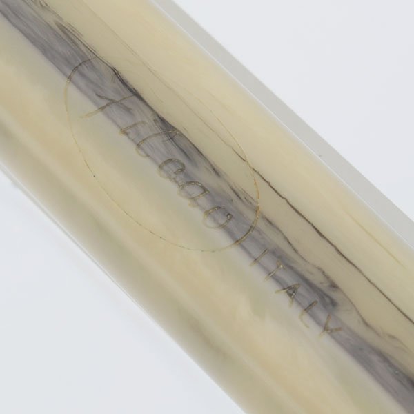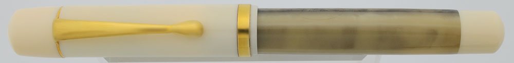 Color Possibly celluloid material. Barrel is sort of a tan or aged ivory horn material. Ivory colored cap and barrel finial. Gold colored trim.