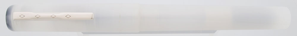 Color Ghost & Smoke, this pen is translucent ghosty white with a gray and white smoke-patterned disc set into the end of the cap. Silver colored clip.