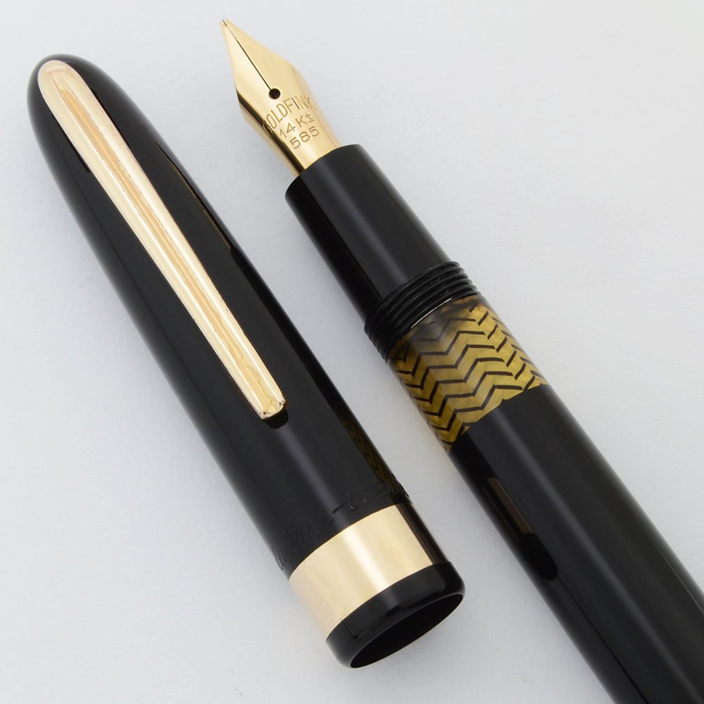 Condition Excellent + condition, in zippered leather case. No cracks, chips, dents, or dings. Trim looks good, just small bits of brassing in a couple of spots, mostly on the barrel band. Ink window is clear, no stains. Imprints are clear. The case is in pretty good shape, just a bit of cracking on one of the edges near the zipper.