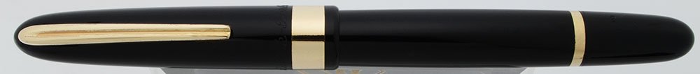 Color Black with 14k gold-filled trim. Rounded ends. 1/4" wide cap band, and a thinner not-quite-1/8" gold band toward the end of the barrel. Clear ink window has an interesting chevron/zig-zag pattern.
