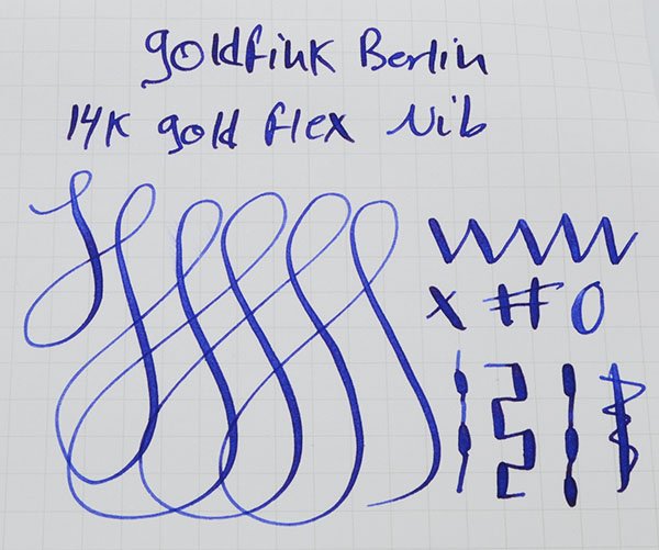 Nib MEDIUM flexible Goldfink 14k gold nib. Nib flexes without too much pressure from medium width to around 1.5mm. See writing sample below.
