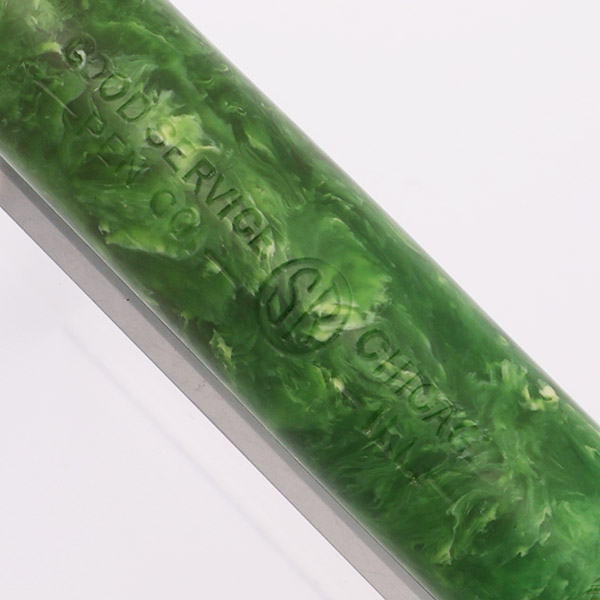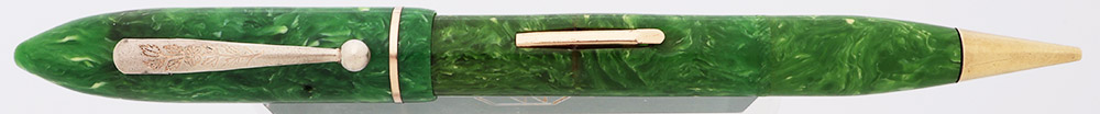 Color Vibrant bright jade green. There is a band of hatching marks just above where the pencil begins. The pen has gold filled trim consisting of a clip (with a flower etching on it), lever, and narrow cap band.