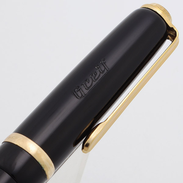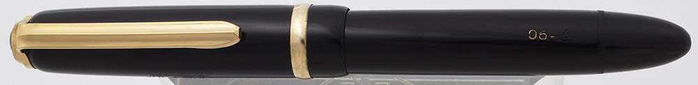 Condition Excellent + condition with no cracks, chips, dents, or dings. This is a classically designed pen in a great color. The barrel has light to moderate scratching, but no noticeable individual scratches. The ink view window has internal staining, but you can see through it with a backlight. The piston knob and barrel have some light marks. The cap has some light scratching. The cap band has some plating wear, but no brassing and glue residue (?) along the edges. There is some plating wear on the clip ring. The imprints are clear.