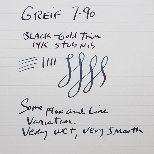 Nib The barrel is marked with 7-90, and after seeing a 1938 catalog page in this FPN thread, we believe that the 7 refers to the pen having a broad, left oblique nib. This oblique cut it subtle, and there's nice flexibility. It's very smooth and wet, and gives good variation. See our writing sample in the photos below.