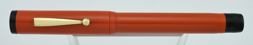 Color Orange celluloid cap and barrel with a black top of the cap and a gold plated clip.