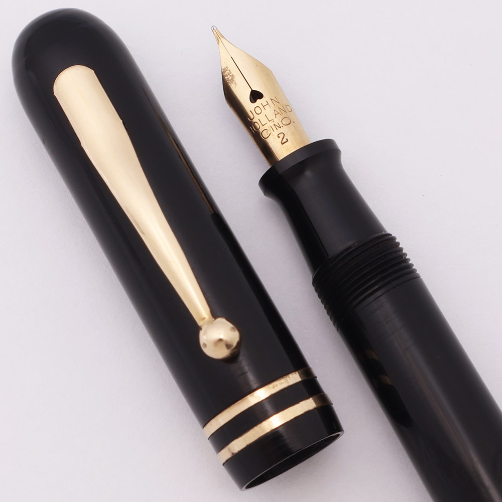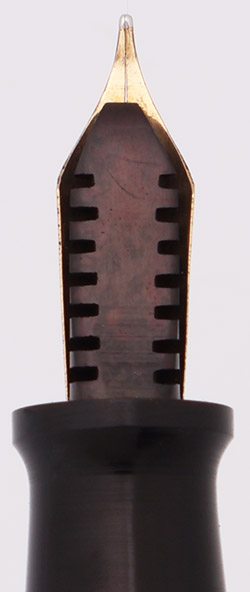 Condition Excellent condition with no cracks. This is a velvety black, shiny pen that has rounded ends and that lists slightly at the end. The barrel has marks caused by the cap lip as well as moderate scratching. The area along the edges of the lever have light chipping. The lever has long, thin micro-scratches and a tad of plating wear. The cap has moderate scratching but no brassing. The double cap bands have moderate microscratching and a tad of plating wear along some of the edges. The clip has light plating wear on the ball end and light microscratching. The imprint is clear.