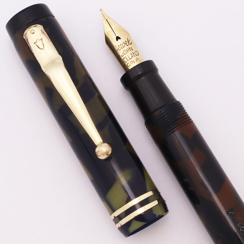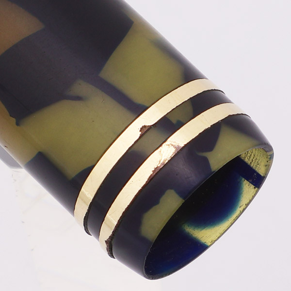 Condition Excellent condition with no cracks. This is a shiny pen in a blue-black and pearl pattern. The barrel is much darker than the cap, although the cap also has some darkening. The barrel has marks caused by the cap lip and moderate scratching. The cap has light to moderate scratching. The cap lip has some transparency in the light and the blue material shows through this (see cap photo below). The lever has heavy pitting. The double cap band has some pitting, especially on the lower band and also moderate microscratching. The clip has plating wear on the ball end and along the top edges. The barrel imprint is clear.