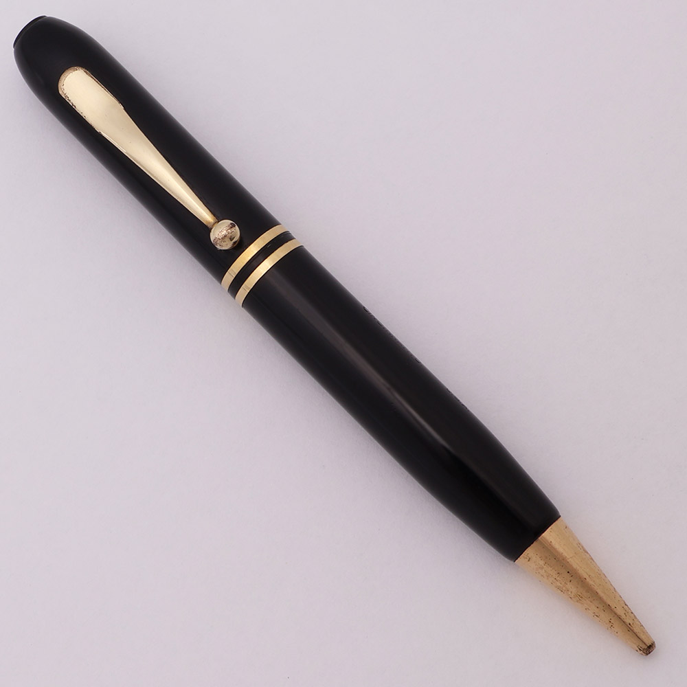 Condition Excellent condition with no cracks, chips, dents, or dings. This is a small, velvety black mechanical pencil that has a vintage look. The cap and barrel have light with some moderate scratching. The cone has moderate microscratching as well as some microdots of plating wear. The double cap band has light microscratching. The clip has plating wear on the ball end and along edges. It otherwise has light microscratching. The imprint is clear.
