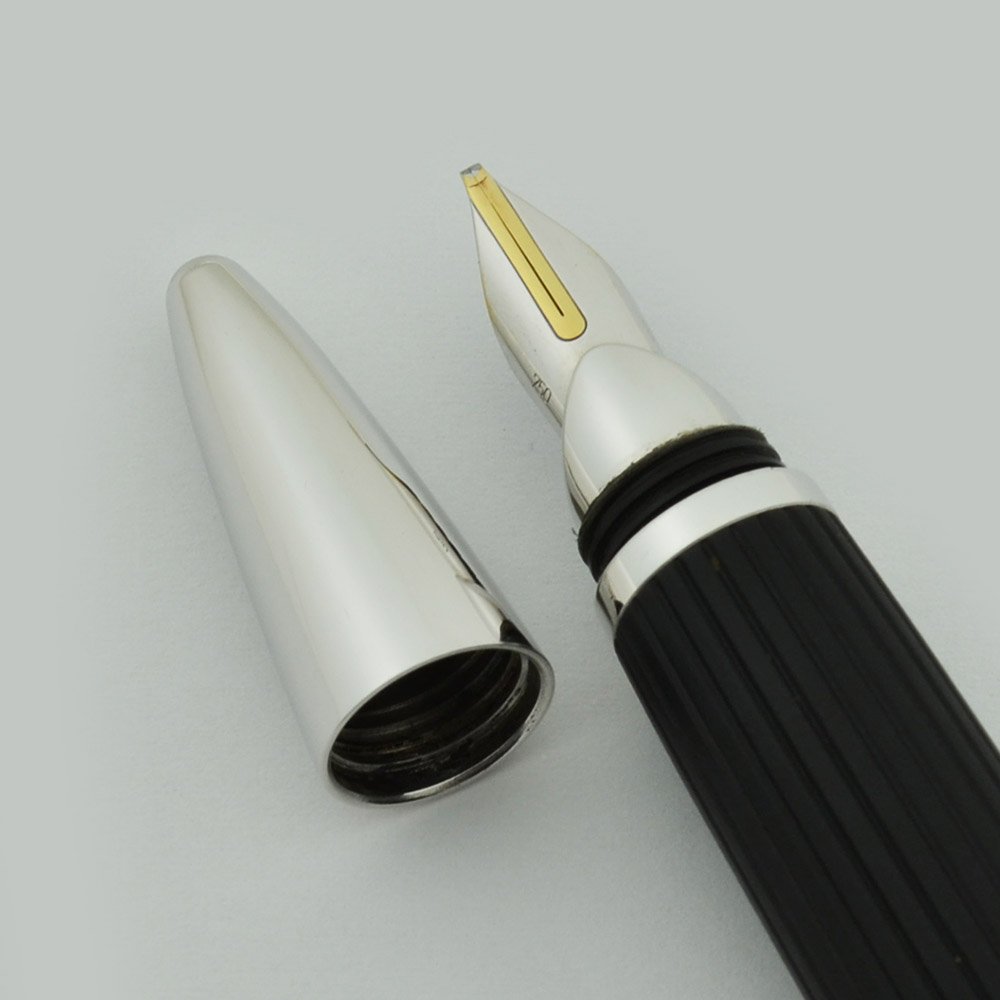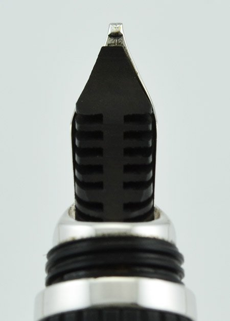Nib 18k medium nib with a cursive italic cut for line variation. It is labeled B for broad (which you see near the barrel threads after unscrewing the barrel). We're guessing it started as a broad and got modified to a medium cursive italic. Very smooth. See the writing sample below.
