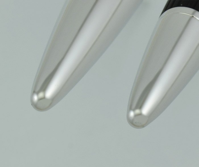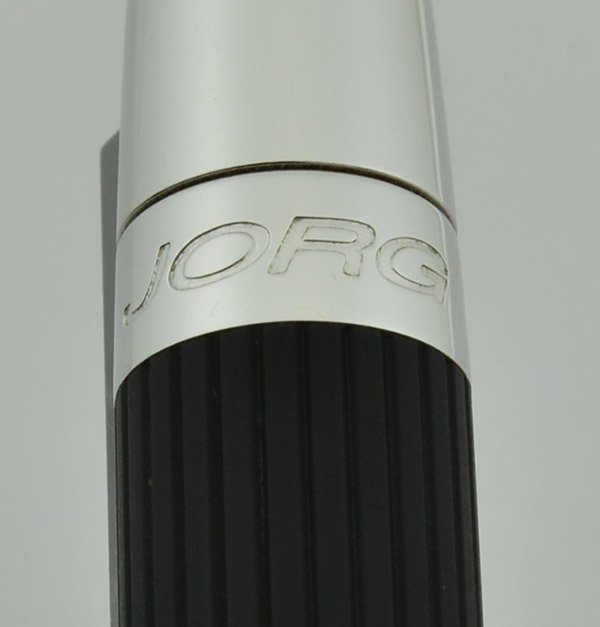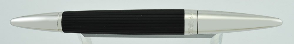 Color Striped black lacquer barrel with palladium plated trim and section. It looks almost like a double sided pen or like a very short desk pen. The pen sleeve is part of the design and has the pen clip on it.