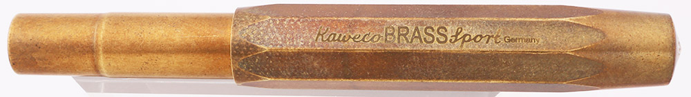 Condition Excellent + condition, in box, with paperwork. This is a heavy weighted, compact, and eye-catsching brass pen. The cap and barrel have acquired some patina, which can be easily polished if you desire. The cap and barrel look great with just a few scattered shallow dings in the surface. The imprints are clear. Ships in Kaweco tin box with a sticker! (The outer cardboard sleeve says that the pen originally came with a medum nib, but it's been swapped out for a broad nib)