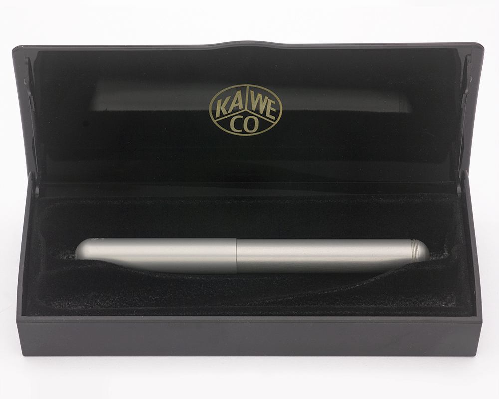 Condition New, mint condition, in box, with an ink cartridge and with no cracks, chips, dents, dings, or scratches. This is a small, bullet shaped pen that is unique. It comes in a black plastic Kaweco box with decorations along the side. The imprints are clear.