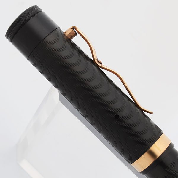 Color Black chased hard rubber. Nice and dark with only minor lightening. Gold filled trim. The cliip has two humps and a pin in the middle and there is a spring at the top of the clip.