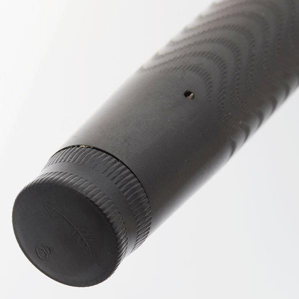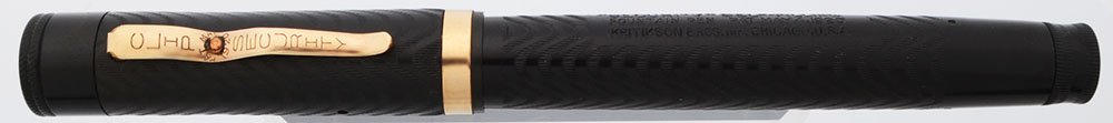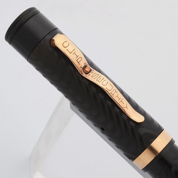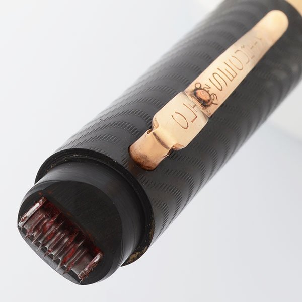 Condition Superior condition with no cracks, chips, dents, or dings. This is a large, substantial pen that has unique features (check protector and unusual clip). The chasing is fully intact on the cap and barrel. The color is excellent with only minor lightening at the end of the barrel. The cap band is excellent. The clip has pitting around the center pin but is otherwise lovely. There are no significant scratches. The imprints are clear.