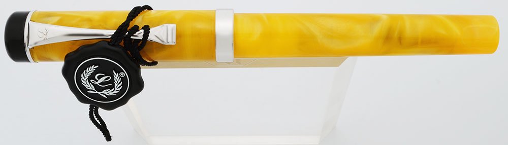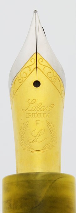 Condition Near mint condition for this lustrous, bright, and shiny pen that comes in its original Laban gift box. The section is a slightly darker color than the rest of the pen, which may be the result of ink or just the black of the nib housing showing through. The pen has some black particles on the barrel threads. The trim looks beautiful. There's a light scratch on the surface of the nib. The back right side of the box is slightly crushed which makes it close crookedly. No cracks, chips, serious scratches, dings or personalization. The imprints are clear.