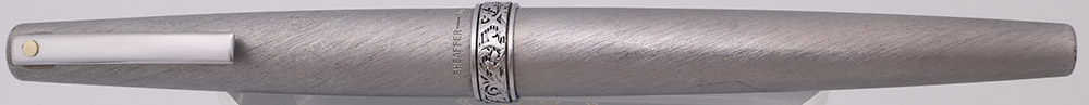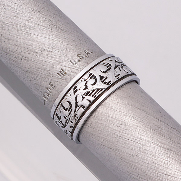 Condition Excellent + condition with no cracks. This is a deeply brushed silver colored pen with a shiny and ornate cap band. Under magnification, we see some shiny marks and small scratches. The edge of the end of the barrel has some tiny dings or dents. The cap band is intact, with minimal scratching and no plating wear. The clip has moderate microscratching. The section has scratching from capping. The white dot has slight discoloration. The imprint is clear.