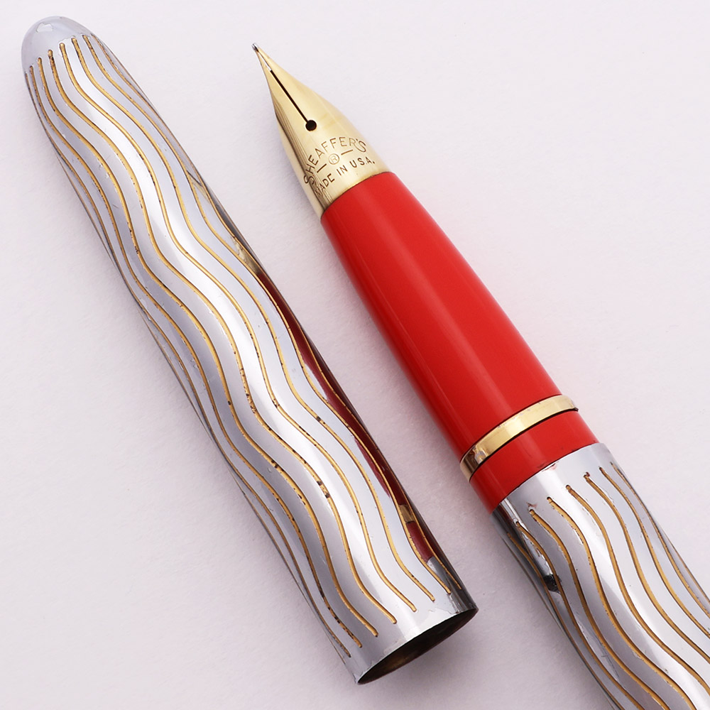Condition Excellent condition with no cracks or dents. This is a sleek, shiny, bullet shaped pen that makes an impression. Some of the gold squiggly lines on the cap and barrel have black dots. The silver has some plating wear along many of the edges and there is moderate scratching all over. There is plating wear at the cap lip. The bright red section looks excellent. There are no imprints.