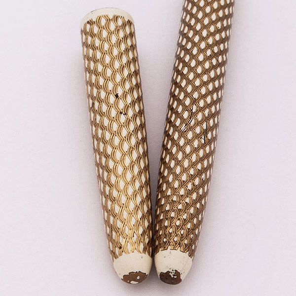 Condition Excellent condition with no cracks for this beautiful, elegant pen and pencil set with lots of shine and with lovely patterning of deep gold outline with pure white inlay. The fountain pen looks excellent. The cap has a few small dots of pitting near the top and the gold paint at the very tip of the cap is chipped. The body of the barrel looks great. There is chip in the paint at the very end of the barrel. The mechanical pencil has paint chipping and discoloration at the very top of the cap portion. There are a few small blotches of paint wear on the barrel section. The cone has plating wear and tarnishing. These imperfections are very difficult to see with the naked eye as the patterning is bold and intact. There are no imprints on either piece.