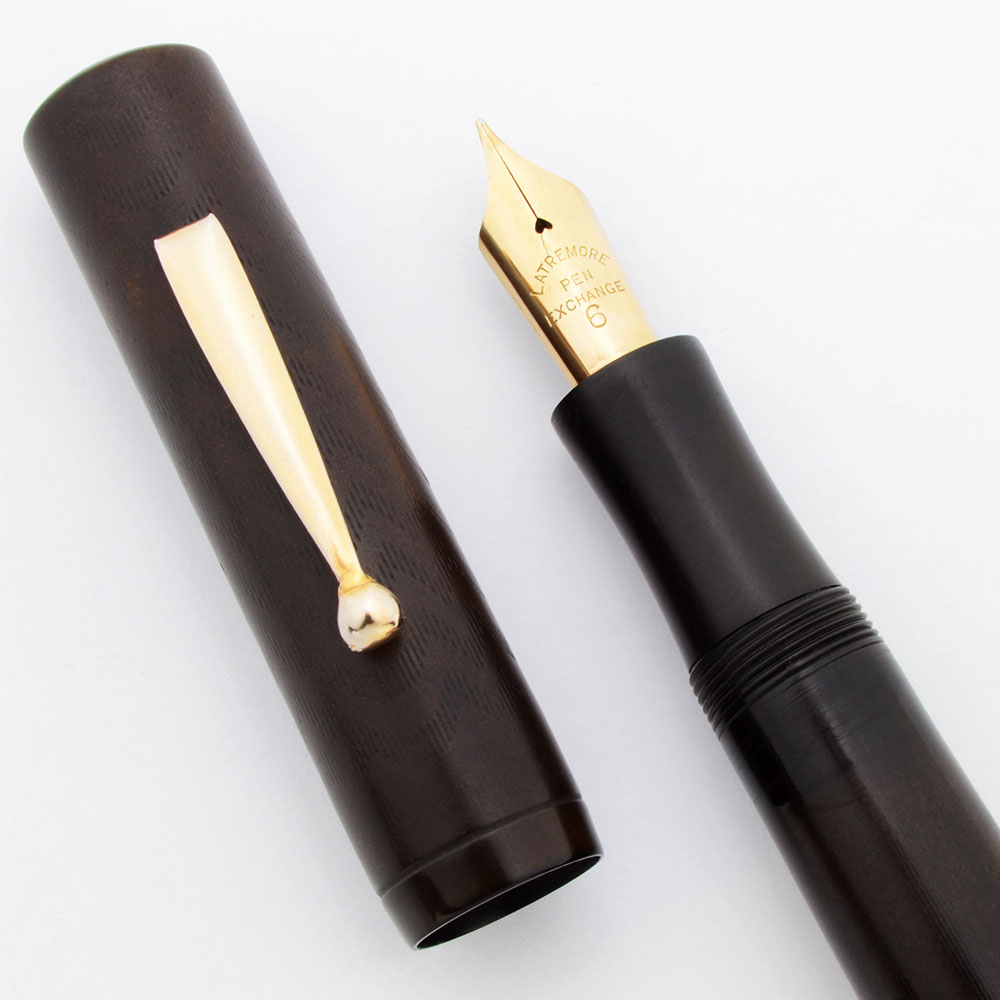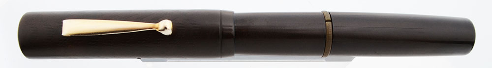 Condition Excellent condition with no chips, dents, or dings. This is a large, impressive pen that has mellowed to a dark chocolate brown color. Although the chasing is worn, it is still visible, especially on the cap. The barrel has marks caused by the cap lip. The cap and barrel are shiny and nice. The gold clip is shiny and excellent. The imprints are worn but readable.