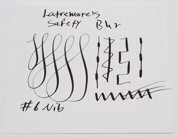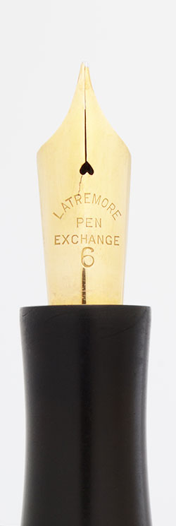 Nib Latrimore Pen Exchange #6 flexible nib. The nib has a crack at the bottom of the breather hole, so it should not be over-flexed. Please see the writing sample below.