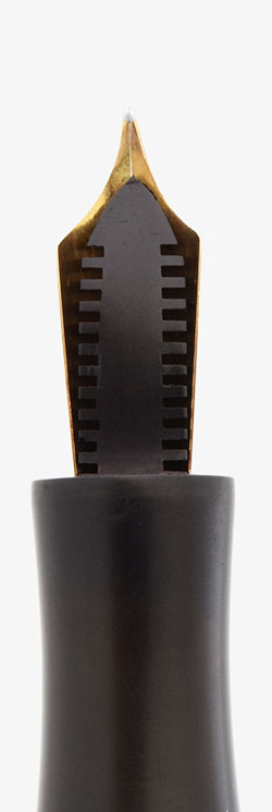 Filling System More formally called a thumb filler, this is commonly called a sleeve filler. The end of the barrel can be pulled away from the section to reveal an open area with a sac and pressure bar. You compress the pressure bar to fill the pen with ink. A new sac has been installed.