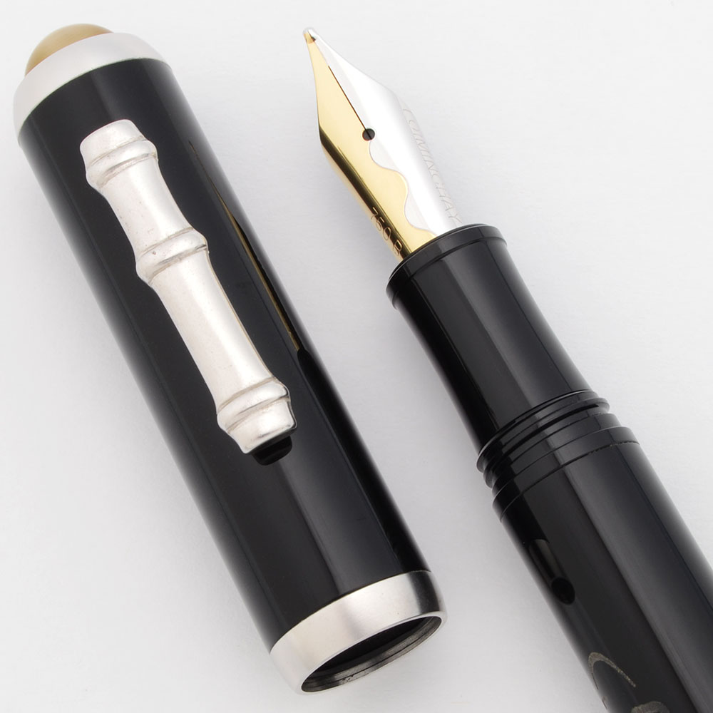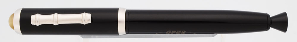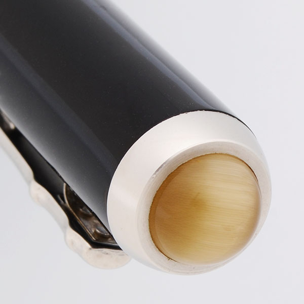 Color Black resin with a metal cone-shaped end finial, which helps give the pen a nice balance. Bamboo clip and cap rings are a matte finished white gold color. The top of the cap features a tiger eye jewel.